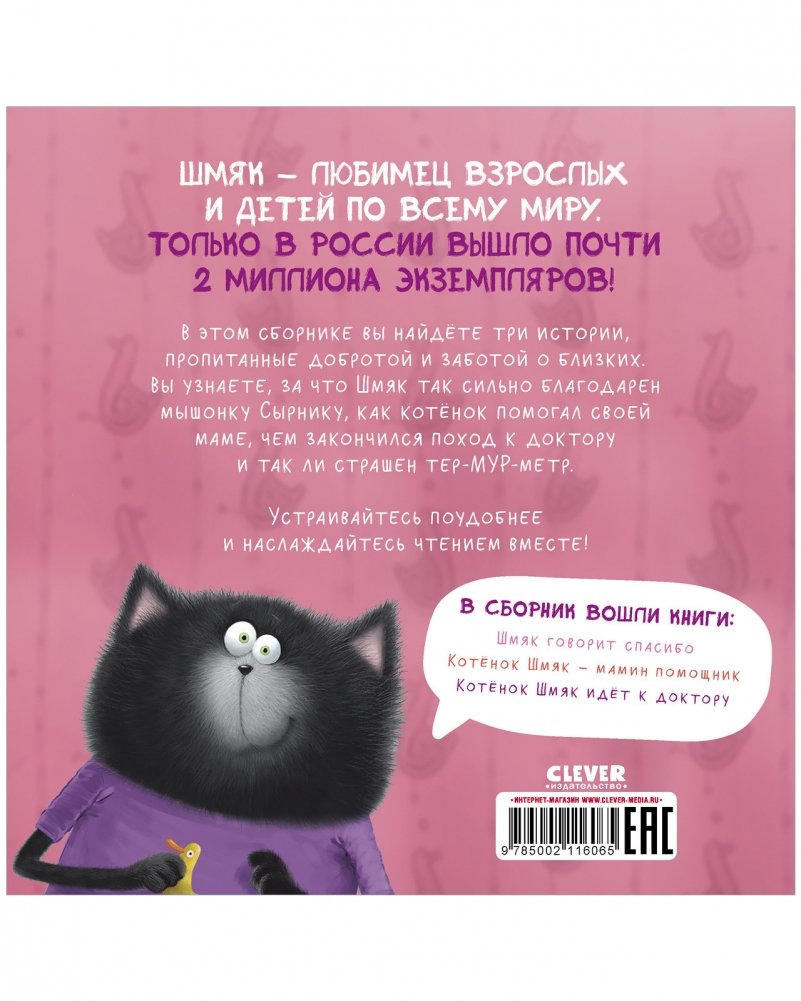 В этом сборнике вы найдёте три истории, пропитанные добротой и заботой о близких. Вы узнаете, за что Шмяк так сильно благодарен мышонку Сырнику, как котёнок помогал своей маме, чем закончился поход к доктору и так ли страшен тер-МУР-метр. Устраивайтесь поудобнее и наслаждайтесь чтением вместе!