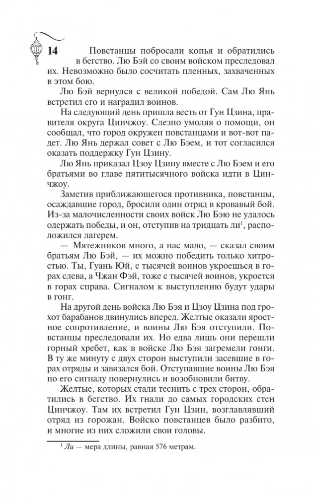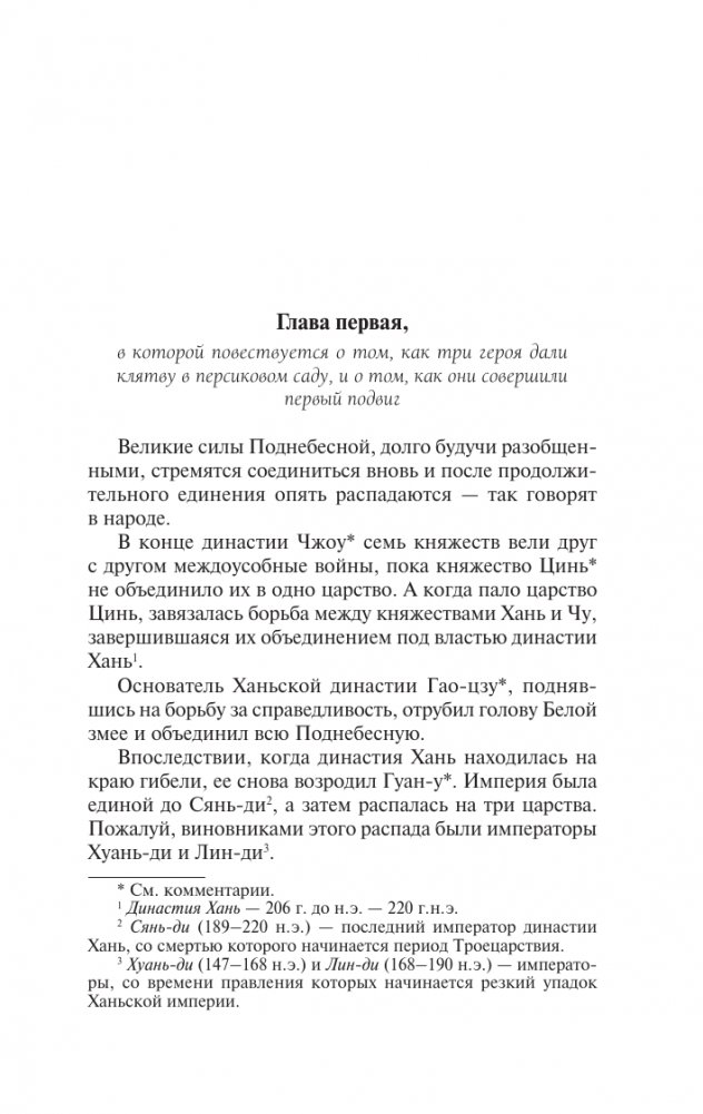 Сочетая исторические хроники с легендами и мифами, Ло Гуань-чжун сплетает масштабное полотно с десятками сюжетных линий и сотнями действующих лиц. Кровопролитные сражения и закулисные битвы за власть, героические подвиги и любовные приключения — и все это на фоне одного из самых драматичных моментов в истории Китая, когда единая Ханьская империя распалась на три независимых государства, беспрерывно воюющих друг с другом.