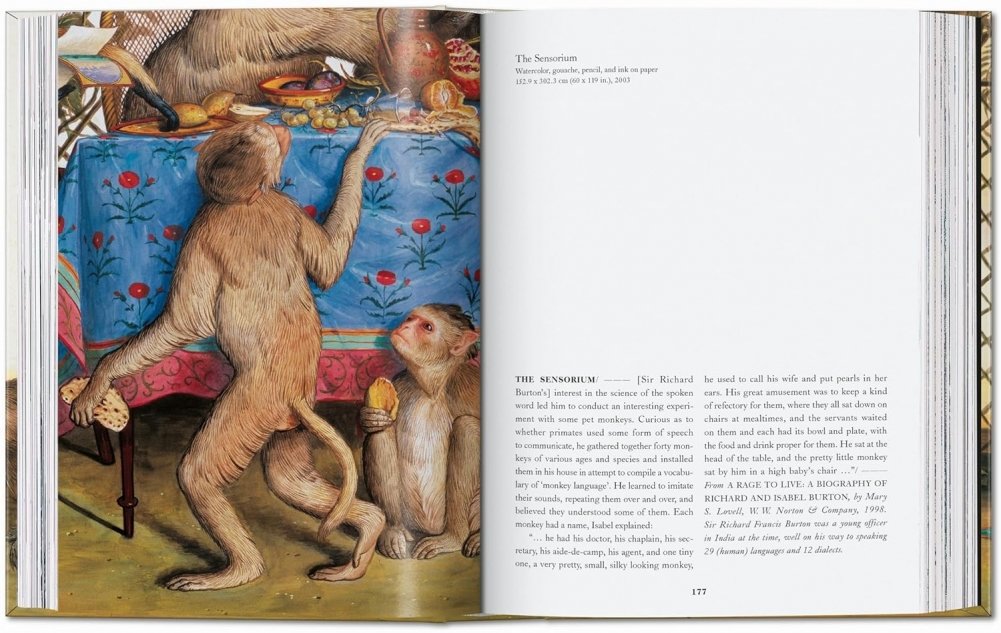 In this stunning but sinister visual universe, beasts and birds are not mere aesthetic objects but dynamic actors in allegorical struggles: a wild turkey crushes a small parrot in its claw; a troupe of monkeys wreaks havoc on a formal dinner table; an American buffalo is surrounded by bloodied white wolves. In dazzling watercolor, the images impress as much for their impeccable realism as they do for their complex narratives.