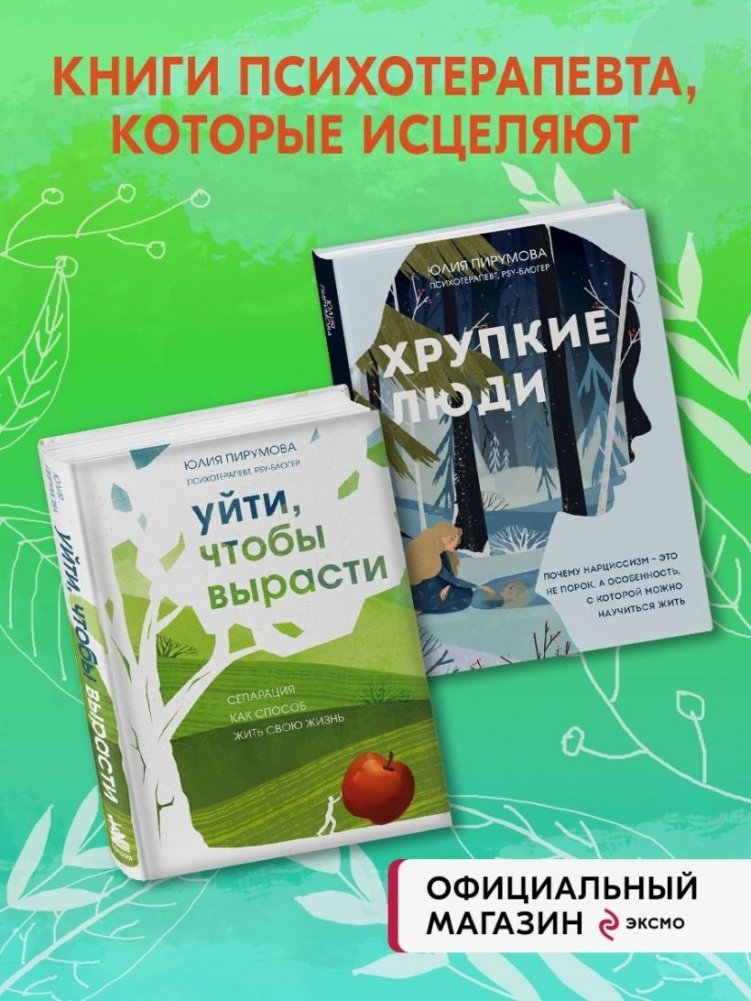 В комплект вошли книги "Хрупкие люди. Почему нарциссизм - это не порок, а особенность, с которой можно научиться жить" и "Уйти, чтобы вырасти. Сепарация как способ жить свою жизнь"