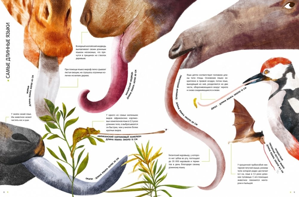 Какой длины язык у малайского медведя? Чем питается карликовая многозубка? Где обитает лягушка-голиаф? На страницах этой книги ты можешь увидеть самых удивительных и необычных животных нашей планеты: сероголовую летучую лисицу, жабу-агу, паука-скакуна, кистеухую белку и многих других. Рассмотри зубы белой акулы, хвост шестиполосой ящерицы-бегуна, коготь каймановой черепахи. Большинство рисунков выполнено в натуральную величину!
