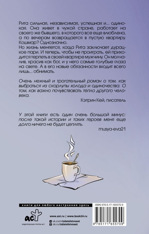 Но жизнь меняется, когда Рита заключает дурацкое пари. И теперь, чтобы не проиграть, ей приходится терпеть в своей квартире мужчину. Он молчалив, красив, как бог, и у него самые голубые глаза на свете. А в его новые обязанности входит всего лишь... обнимать.