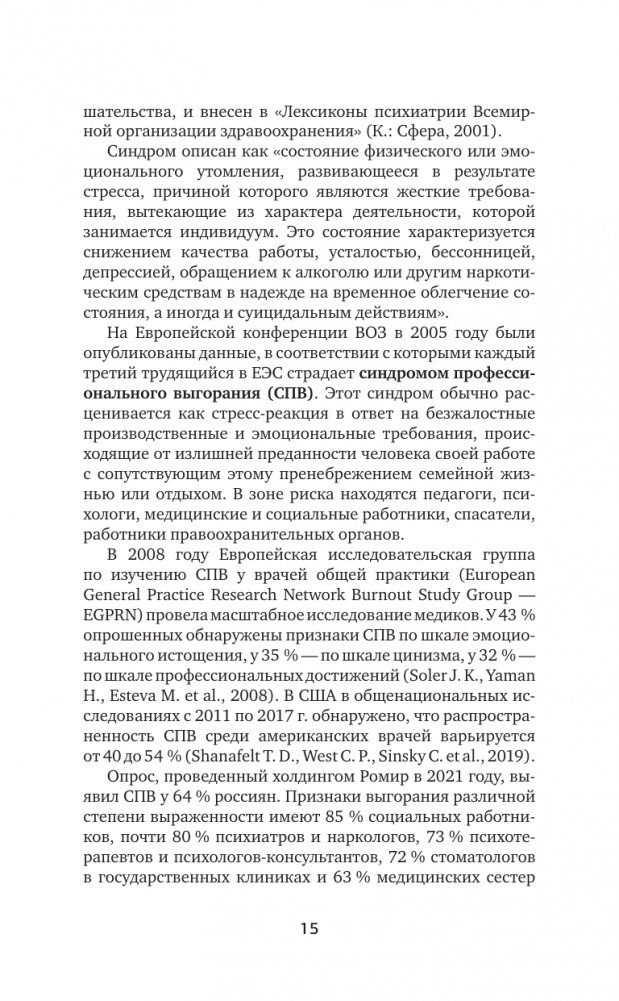 Автор книги — Г. В. Старшенбаум, врач-психотерапевт с полувековым стажем работы, подробно расскажет о симптомах и видах профессионального выгорания, а также о способах его профилактики и преодоления. Подробные тесты помогут вам диагностировать профессиональное выгорание у себя, своих близких, пациентов или клиентов. А специальные упражнения станут хорошим средством профилактики выгорания и совладания с ним.