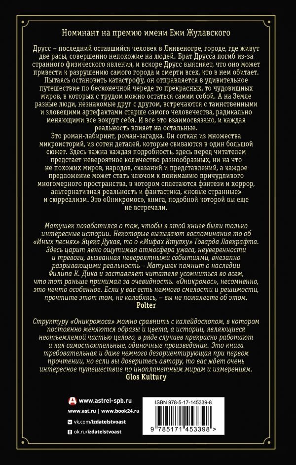 Это роман-лабиринт, роман-загадка. Он соткан из множества микроисторий, из сотен деталей, которые свиваются в один большой сюжет. Здесь важна каждая подробность, здесь перед читателем предстает невероятное количество разнообразных, ни на что не похожих миров, народов, сказаний и представлений, а каждое предложение может стать ключом к пониманию причудливого многомерного пространства, в котором сплетаются фэнтези и хоррор, альтернативная реальность и фантастика, "новые странные" и сюрреализм. Это "Оникромос", книга, подобной которой вы еще не встречали.