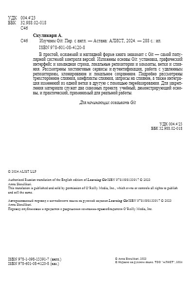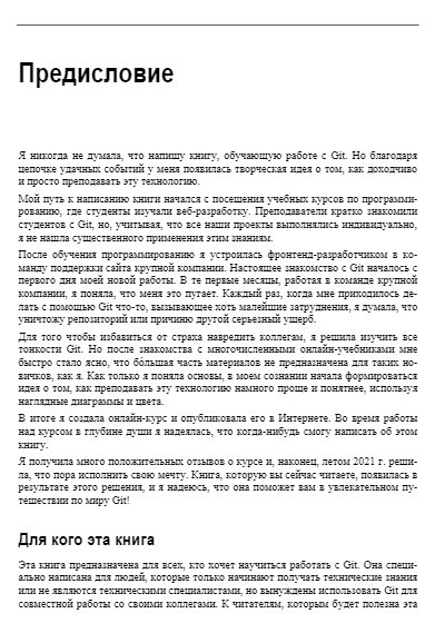 В простой, осязаемой и наглядной форме книга знакомит с Git – самой популярной системой контроля версий. Изложены основы Git: установка, графический интерфейс и командная строка, локальные репозитории и коммиты, ветки и слияния. Рассмотрены хостинговые сервисы и аутентификация, работа с удаленным репозиторием, клонирование и локальное сохранение. Подробно рассмотрены трехсторонние слияния, конфликты слияния, запросы на слияние, а также интеграция изменений из одной ветки в другую с помощью перебазирования. Для закрепления материала служат два сквозных проекта: учебный, демонстрирующий основы, и практический, применимый для реальной работы.