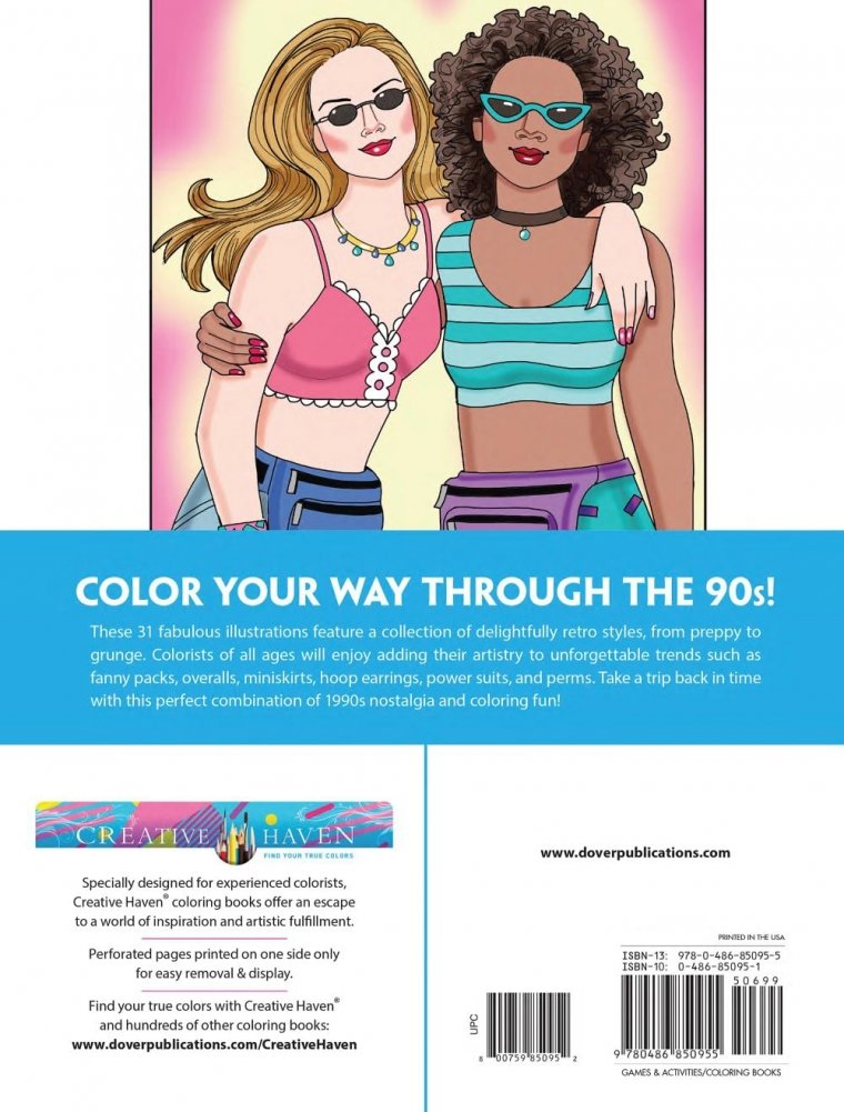 These 31 fabulous illustrations feature a collection of delightfully retro styles, from preppy to grunge. Colorists of all ages will enjoy adding their artistry to unforgettable trends such as fanny packs, overalls, miniskirts, crop tops, hoop earrings, power suits — even flattops and perms! Relax and unwind with this perfect combination of ’90s nostalgia and coloring fun. The artwork is printed on one side only, and the pages are perforated for easy removal and display.