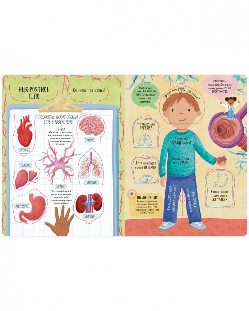 Книга дает простые толкования сложным понятиям, текст специально адаптирован для восприятия ребенка, а красочные иллюстрации помогают наглядно представить устройство человеческого организма, удерживать внимание и интерес. На каждом развороте — несколько вопросов, ответы на которые прячутся под окошками.