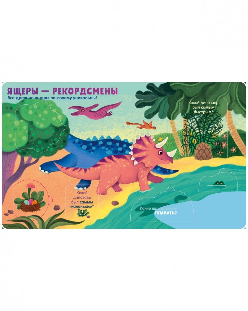 Рассматривайте яркие картинки в книжке «Динозавры», открывайте окошки и запоминайте интересное о доисторических животных!