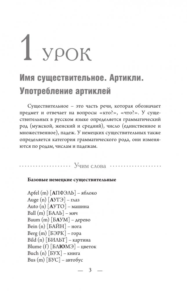 Данный самоучитель содержит лексический и грамматический материал для изучения немецкого языка с нулевого уровня. Большое количество наглядных примеров и таблиц облегчает запоминание материала. Для закрепления полученных знаний к каждому уроку приводятся упражнения, ключи к которым удобно расположены рядом.