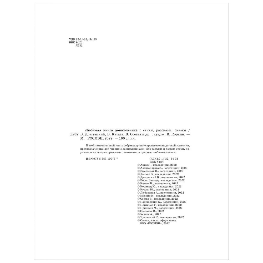 В этой замечательной книге собраны лучшие сказки, стихи и рассказы для чтения с дошкольниками: Федорино горе» К. Чуковского, Никто» и Дырки в сыре» Б. Заходера, Кот Ворюга» К. Паустовского, Дудочка и кувшинчик» В. Катаева, Тайное становится явным» В. Драгунского, Кот в сапогах» Ш. Перро, Принцесса на горошине» Х. К. Андерсена, Бременские уличные музыканты» братьев Гримм и многие другие.