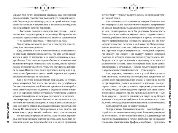 Ночной Базар в опасности: из подлунного мира вырвались темные древние существа, яркие огоньки у шатров и прилавков постепенно исчезают, а свет луны тускнеет с каждым днем. Лесная королева умирает — а вместе с ней весь магический мир. И только Холд с помощью лекаря Хозила может всех спасти. Тем временем Каз и Али застряли в мире людей. Парень хочет вернуться в Ночной Базар, но бесконечные препятствия — погони, предательства, тюрьма и ярость короля — не дают ему найти проход в волшебный мир. Смогут ли герои обрести дом? «Ночной Базар. Путь домой» — завершающая часть дилогии Миры Арим.