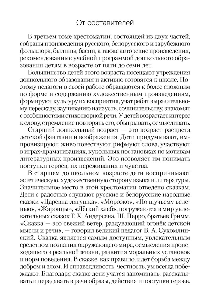 Хрестоматия включает произведения художественной литературы, рекомендованные учебной программой дошкольного образования (образовательная область «Художественная литература») для работы с детьми от 5 до 7 лет.