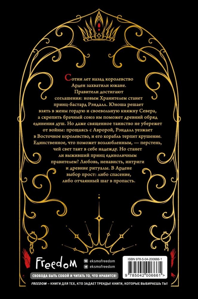Сотни лет назад королевство Арден захватили южане. Правители достигают соглашения: новым Хранителем станет принц-бастард Рэндалл. Юноша решает взять в жены гордую и своевольную княжну Севера, а скрепить брачный союз им поможет древний обряд единения душ. Но даже священное таинство не убережет от войны: прощаясь с Авророй, Рэндалл уезжает в Восточное королевство, и его корабль терпит крушение. Единственное, что поможет возлюбленным — перстень, чей свет таит в себе надежду. Но станет ли выживший принц единоличным правителем? Любовь, ненависть, интриги и древние ритуалы. В Ардене выбор прост: либо спасение, либо отчаянный шаг в пропасть.