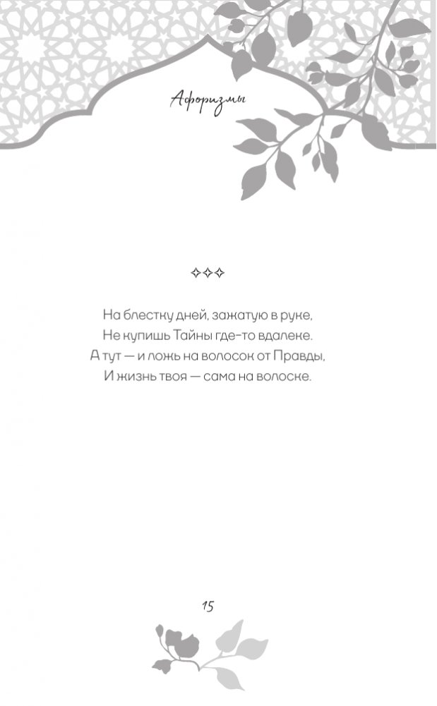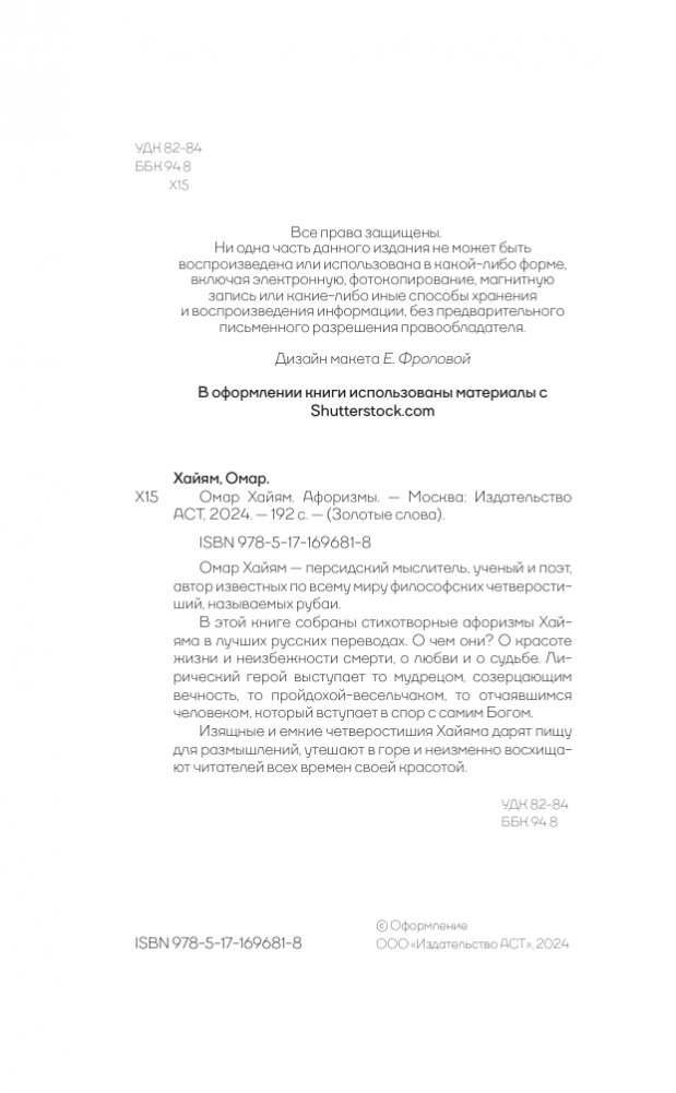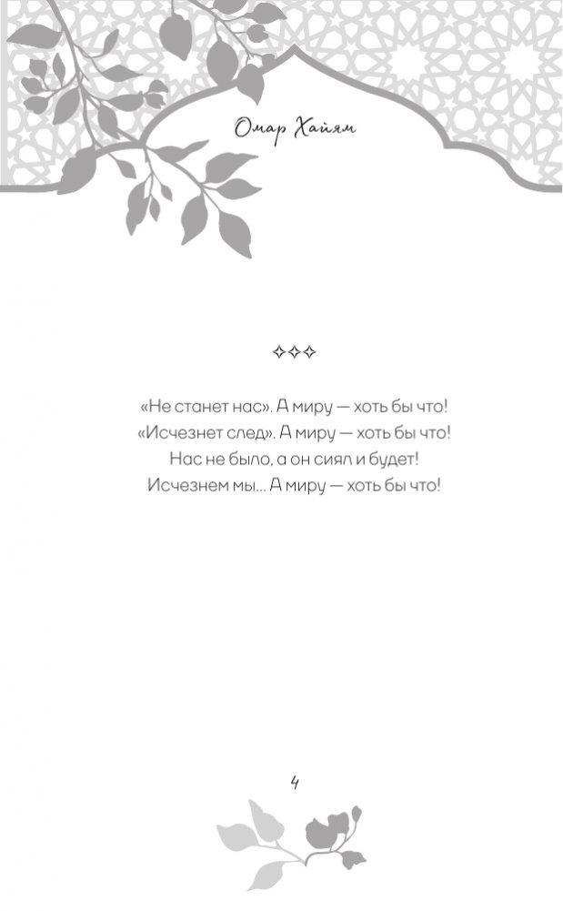 В этой книге собраны стихотворные афоризмы Хайяма в лучших русских переводах. О чем они? О красоте жизни и неизбежности смерти, о любви и о судьбе. Лирический герой выступает то мудрецом, созерцающим вечность, то пройдохой-весельчаком, то отчаявшимся человеком, который вступает в спор с самим Богом. Изящные и емкие четверостишия Хайяма дарят пищу для размышлений, утешают в горе и неизменно восхищают читателей всех времен своей красотой.