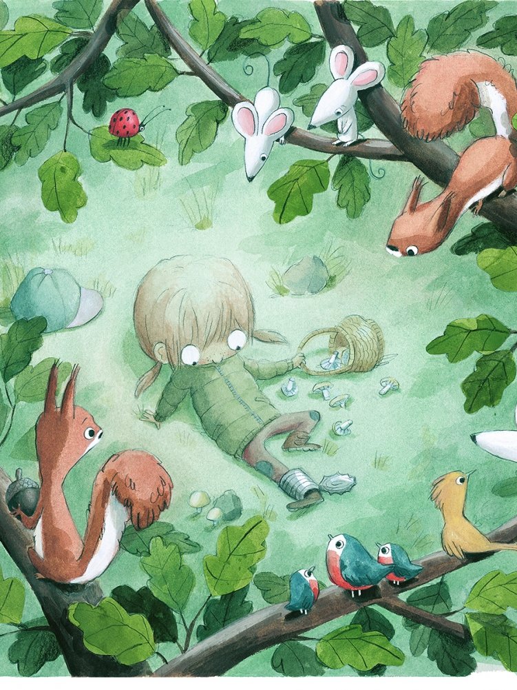 Сухие листья хрустели под ногами. Марина шла по лесу, вдыхая запах влажной земли... Вдруг её нога попала во что-то твёрдое с острыми краями. Это консервная банка! Ступня Марины застряла! К счастью, девочке на помощь поспешили лесные жители.