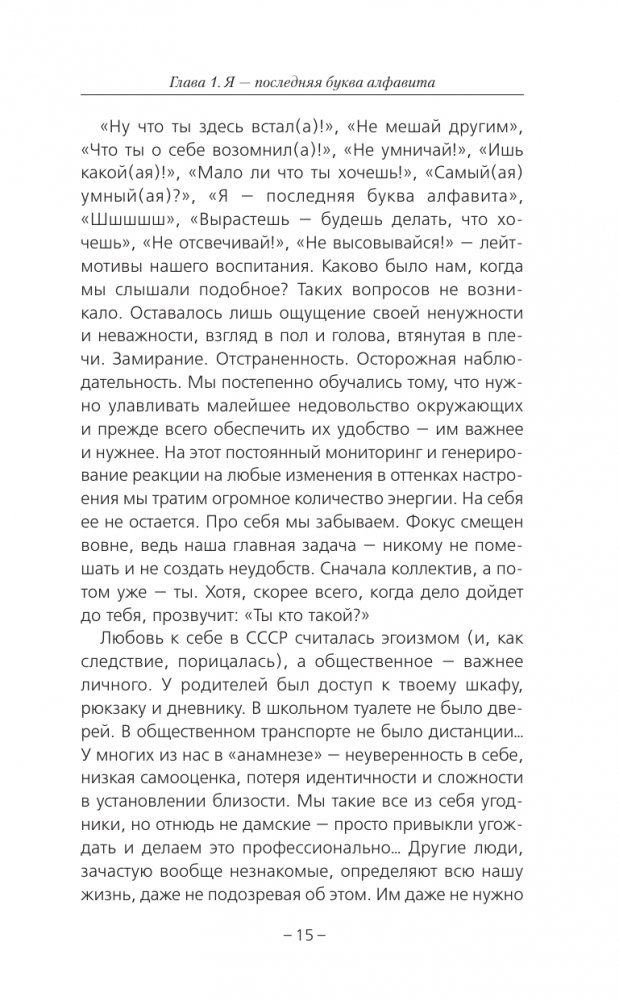 Перед вами не просто книга о психологических установках, это приглашение в путешествие к себе, основа для новой, более свободной, расслабленной и счастливой жизни в современном мире. Эта книга для девочек и мальчиков, которые родились еще в советское время и выросли, пытаясь понравиться каждому, извиняясь за свое существование, боясь сделать новый шаг, позволить себе незнание, ошибку или слабость.