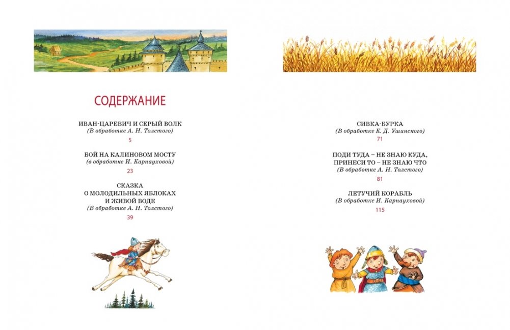 В эту книгу вошли сказки: «Иван-царевич и серый волк», «Бой на Калиновом мосту», «Сказка о молодильных яблоках и живой воде», «Сивка-бурка», «Поди туда – не знаю куда, принеси то – не знаю что», «Летучий корабль».