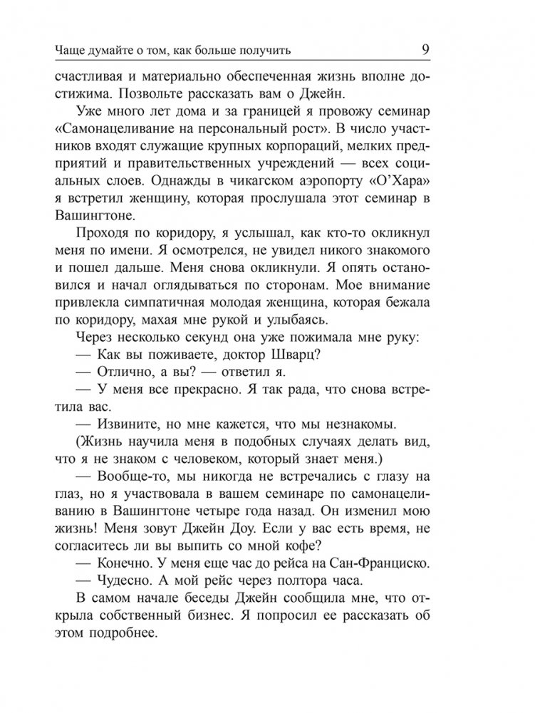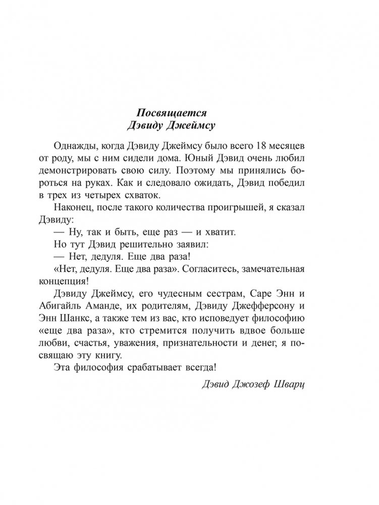 Дэвид Шварц прошел путь от ученика провинциальной школы до президента собственной компании и знаменитого лектора, который провел несколько тысяч семинаров в торговых ассоциациях, коммерческих организациях и школах менеджмента. Эту книгу можно считать продолжением его первого бестселлера — «Искусство мыслить масштабно», где Шварц представляет свою «фирменную» формулу успеха.