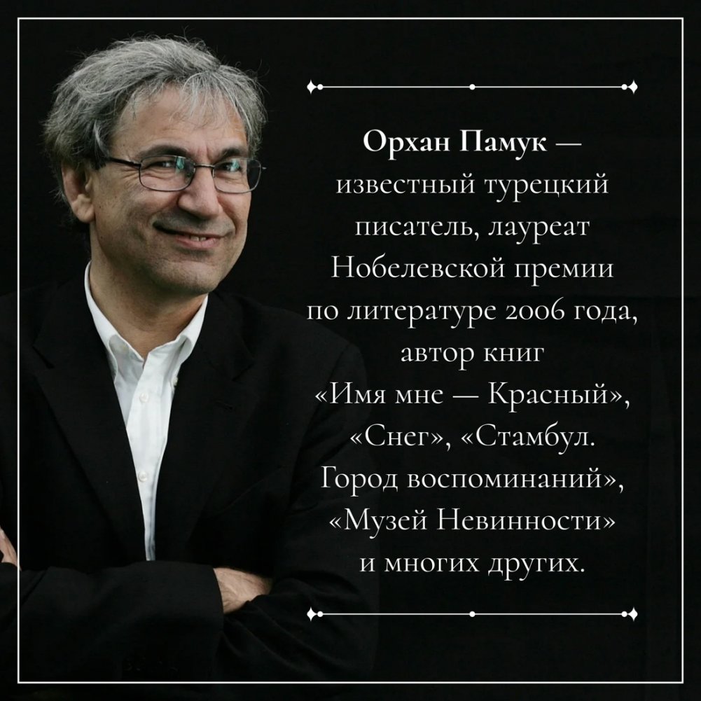 Орхан Памук — известный турецкий писатель, лауреат Нобелевской премии по литературе 2006 года, автор книг «Имя мне — Красный», «Снег», «Стамбул. Город воспоминаний», «Музей Невинности» и многих других.