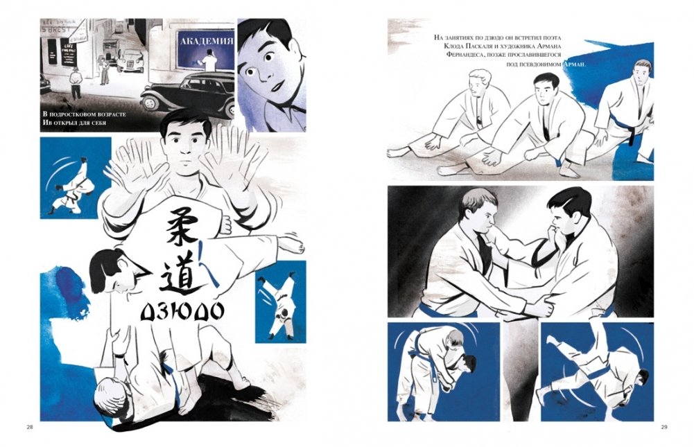 В издательстве «КоЛибри» с этой проблемой решили бороться нестандартно – и выпустили биографию «продавца пустоты» Ива Кляйна в формате графического романа. Тут и перфомансы с голыми женщинами в синей краске, и выставка без экспонатов, и «прыжок в пустоту» (ох уж эти наивные зрители середины XX века, как легко было удивить вас монтажом!), и, главное, объяснение, зачем ему все это понадобилось. Рассказано живо, нарисовано в стиле самого Кляйна, а в конце еще и репродукции и уникальные фотографии художника, предоставленные Фондом наследия Кляйна специально для этого издания.