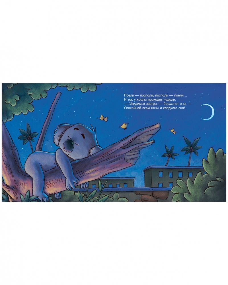 Маленькая коала живет в зоопарке, она только и делает, что ест. А потом спит. А потом снова ест. Ест зеленые листья и спит, уцепившись за ветку дерева. А что делали днем ее друзья? Львята играли и боролись, но вот пришел вечер, мама-львица уложила своих малышей спать. А кенгуру? Она скакала весь день и вот устала и тоже собирается прилечь.