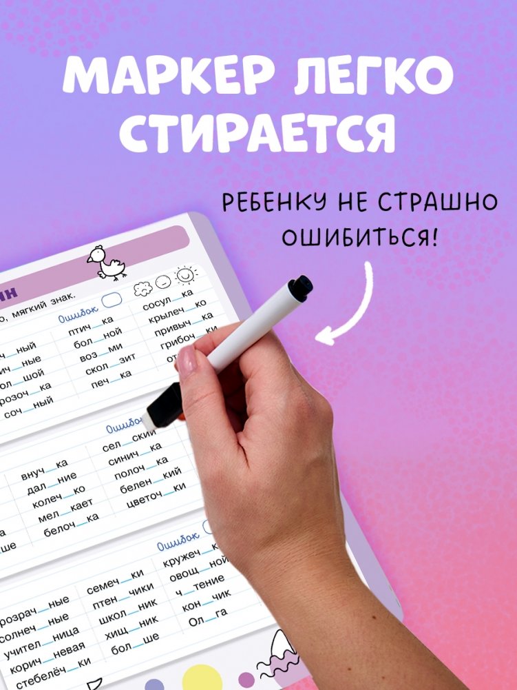 След маркера легко стирается ластиком на колпачке или салфеткой, поэтому ученики могут писать и стирать написанное, возвращаясь к упражнению столько раз, сколько будет нужно.