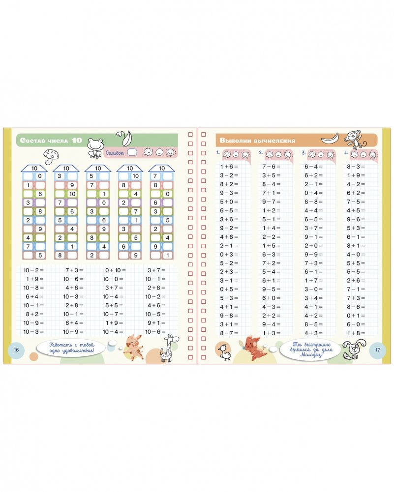 На каждой странице тетрадки «Математика. 1 класс» ребенка будут подбадривать и веселить милые зверюшки, которых, кстати, можно раскрашивать!
