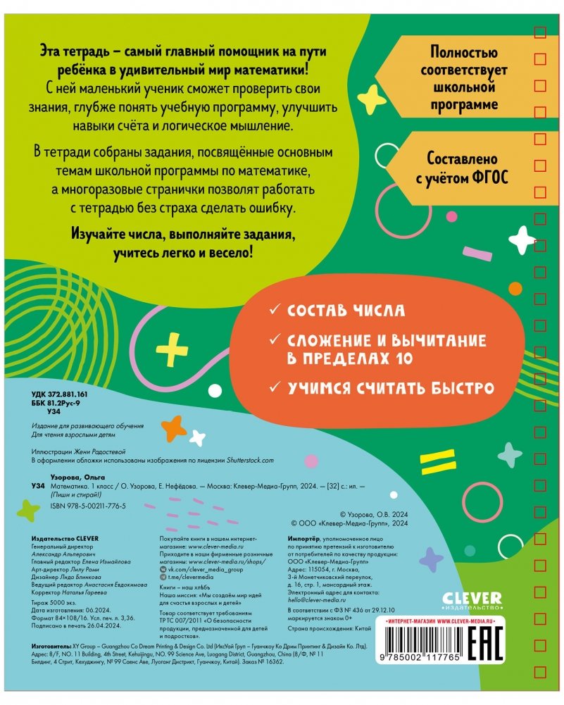 С тетрадью «Математика. 1 класс» первоклашка сможет проверить свои знания, глубже понять учебную программу, улучшить навыки счета и логическое мышление.
