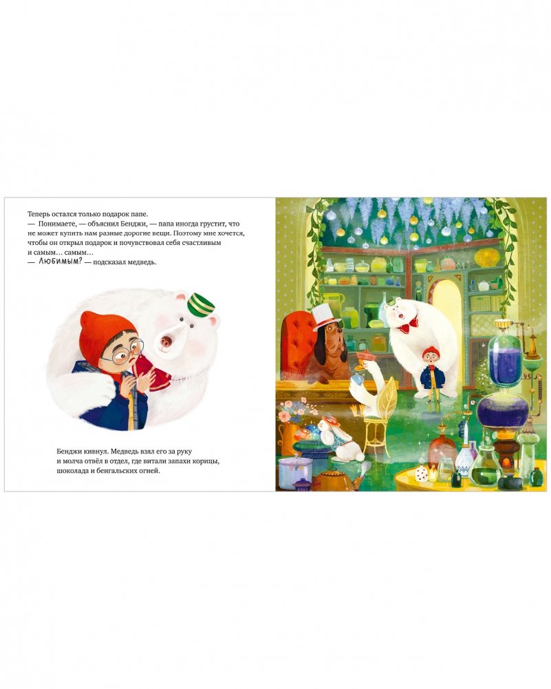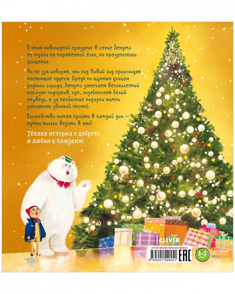 В этот новогодний праздник в семье Бенджи не ждали ни наряженной ёлки, ни праздничного угощения. Но не зря говорят, что под Новый год происходят настоящие чудеса. Бредя по шумным улицам родного города, Бенджи замечает великолепный магазин подарков, где… хозяйничает белый медведь, а за необычные подарки можно заплатить звонкой песней.