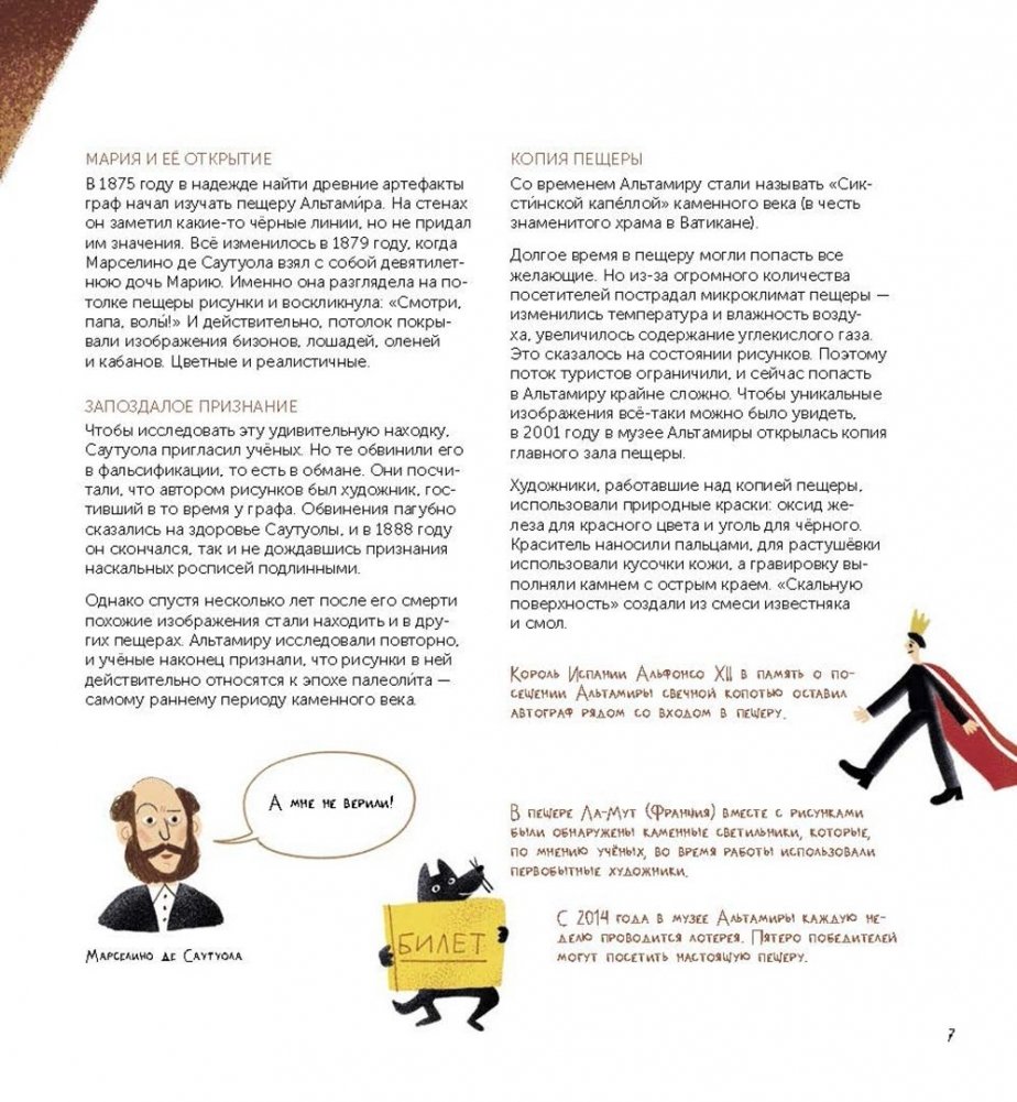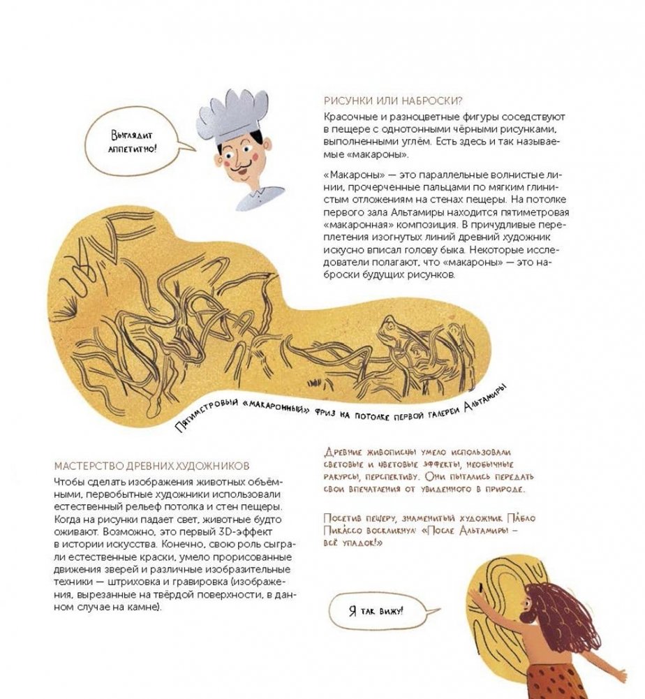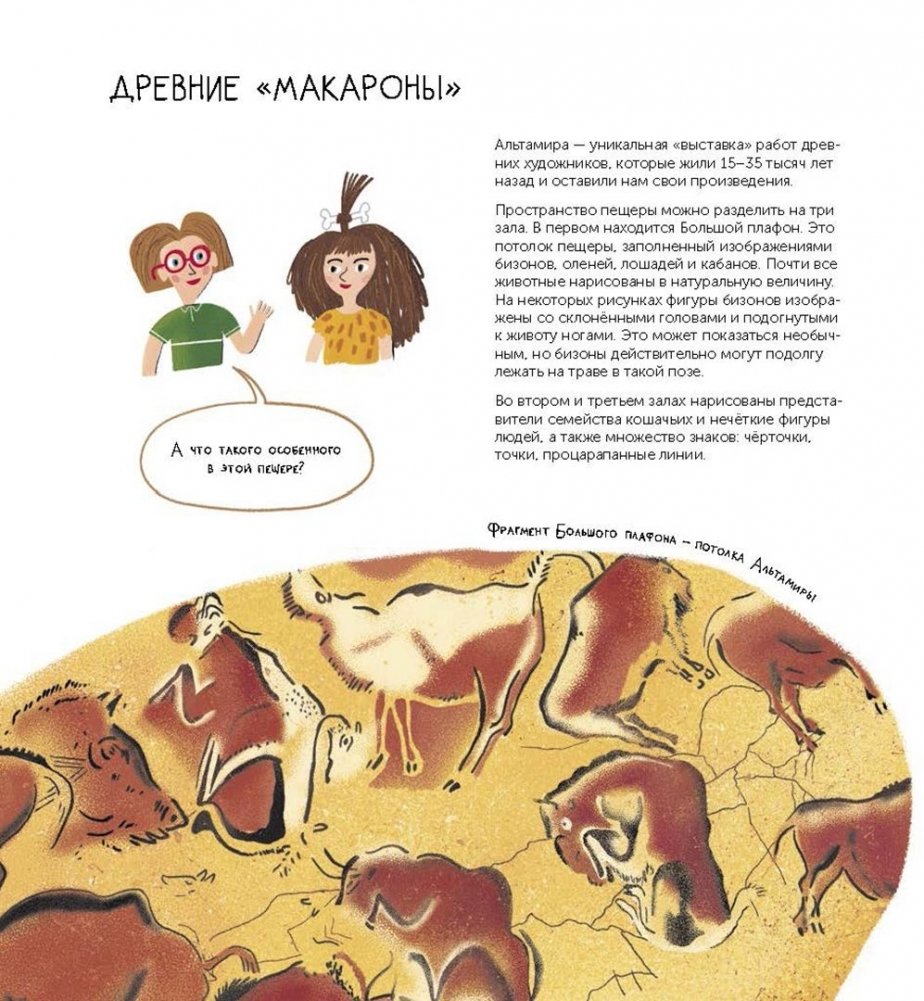 Первые картинные галереи появились ещё 40 000 лет назад! Что же за художники там выставлялись? К сожалению, их имена мы никогда не узнаем. Зато они оставили нам свои шедевры, с которыми можно познакомиться прямо здесь и сейчас! Вместе с героями книги - историческими личностями, а также современными учёными и просто случайными исследователями - вы посетите самые знаменитые пещеры с наскальными рисунками и узнаете, как древним художникам эпохи палеолита удавалось рисовать в темноте; зачем художники каменного века изображали макароны; почему древние австралийцы рисовали изображения, похожие на рентгеновские снимки. Для среднего школьного возраста.