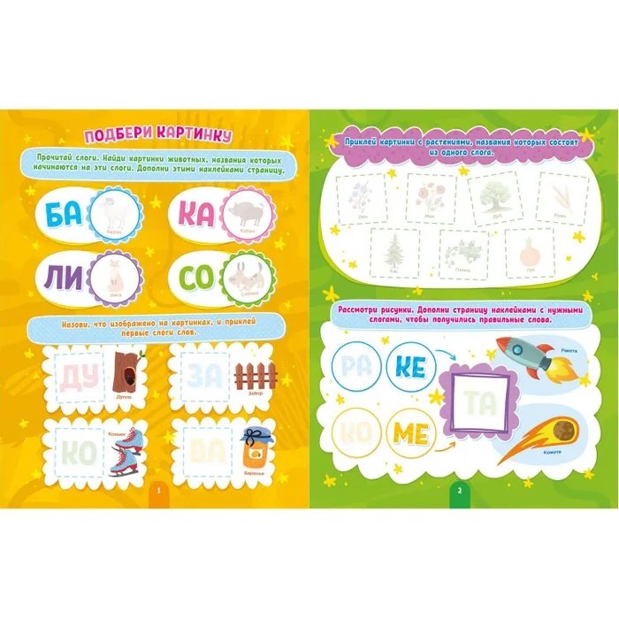 Дети наклеивают картинки, буквы и цифры и в увлекательной форме учат алфавит, осваивают счёт, тренируют логику и узнают много нового об окружающем мир.