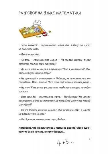 Как подружить дошкольника с математикой? Автор книги - педагог Татьяна Мельникова - рекомендует, прежде всего, отказаться от решения бесконечных столбиков с примерами, которое тренирует только механическое заучивание. В то время как стоит заняться развитием математического мышления: научить малыша наблюдать и действовать, рассуждая "что случилось". Например, с кошкой, которой не дорисовали лапу, или с конфетами, которые неожиданно закончились. Вместе с подобными рассуждениями и разговорами в жизнь малыша сами собой придут первые задачи, как пришли они в жизнь героя книги Алёши и его друга - сенбернара Сени. Вместе с Алёшей и Сеней, а также таксой Аделаидой, бульдогом Хотдогом, спаниелем Мигелем, слонами, жирафами и даже жуками-солдатиками ваш ребёнок научится легко решать первые задачки и по-настоящему полюбит математику. Позаботился автор и о тех, кто помогает малышу: во "взрослой" части книги вы найдёте ответы на возможные вопросы и получите вдохновляющую поддержку в деле обучения математике. Издание для родителей.