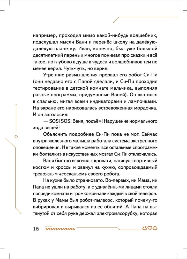 Маленький робот Си-Пи сделан из обычных бытовых приборов мальчиком Ваней и его отцом, но внутри малыша-робота находится одна тайна. Именно она приводит Си-Пи и Ваню в секретную подземную страну Недрусь, населённую роботами и биоботами. С маленькими героями происходит череда головокружительных событий, которые начинаются с истории о разбившемся когда-то на Земле инопланетном корабле и угрозы существования всему человечеству. Судьба двух миров искусственных существ — Голубого и Красного — зависят от того, хватит ли смелости и смекалки у московского мальчика Ивана Че и его маленького робота Си-Пи... Нейрокристаллы и сражение на плазменных мечах, конкурс стихов между носителями Искусственных Мозгов и первая любовь мальчика и девочки-биобота, будущее и настоящее человечества и ответ на вопрос, готов ли робот на самопожертвование, — всё это в новой книге Ольги Усковой, президента Российской компании по производству искусственных мозгов для роботов «Когнитив Пилот», и автора взрослых книжек-бестселлеров про искусственный интеллект «Этюды Черни» и «Раша».