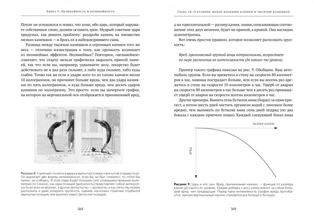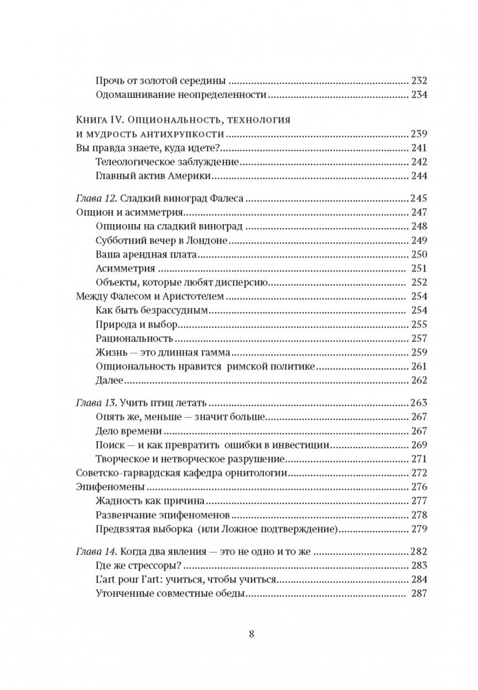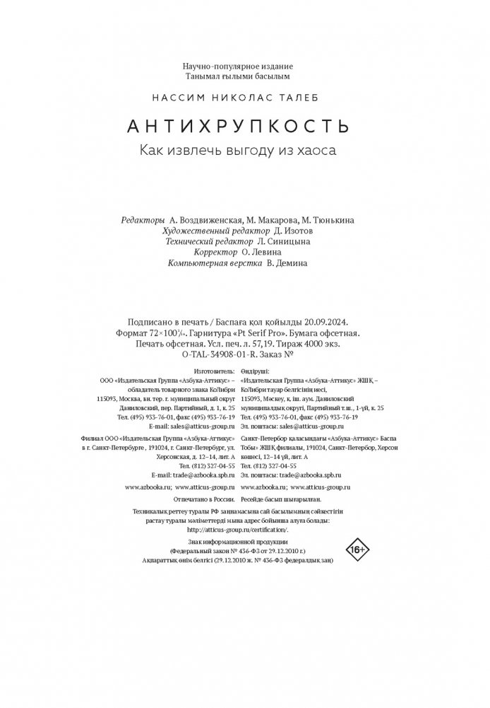 «Антихрупкость» — книга уникальная: она рассказывает о ключевом свойстве людей, систем и не только, свойстве, у которого до сих пор не было названия. В мире, где царит неопределенность, нельзя желать большего, чем быть антихрупким, то есть уметь при столкновении с хаосом жизни не просто оставаться невредимым, но и становиться лучше прежнего, эволюционировать, развиваться. Талеб формулирует простые правила, которые позволяют нам преодолеть хрупкость и действовать так, чтобы непредсказуемая неопределенность, тот грозный и внезапный Черный лебедь, не причинила нам вреда — и более того, чтобы эта редкая и сильная птица помогла нам совершенствоваться. Для этого следует в первую очередь осознать: мы по природе своей антихрупки и не должны позволять кому бы то ни было лишать нас этого чудесного свойства.