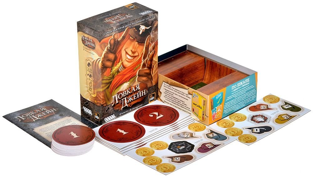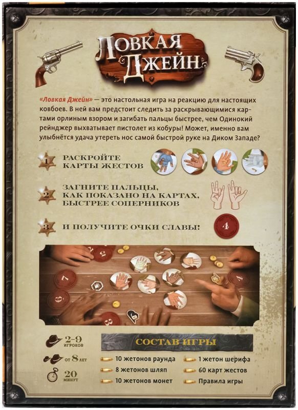 "Ловкая Джейн" – это настольная игра на реакцию для настоящих ковбоев. В ней вам предстоит следить за раскрывающимися картами орлиным взором и загибать пальцы быстрее, чем Одинокий рейнджер выхватывает пистолет из кобуры! Может, именно вам улыбнётся удача утереть нос самой быстрой руке на Диком Западе?