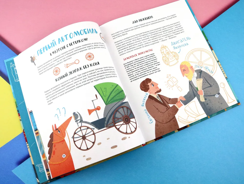 Книга расскажет, в каком городе запустили первый автобусный маршрут, когда появился первый регулировщик движения и как готовили машинистов первого подземного поезда, какие удобства были в первом самолёте и почему аэросани считались транспортом будущего.