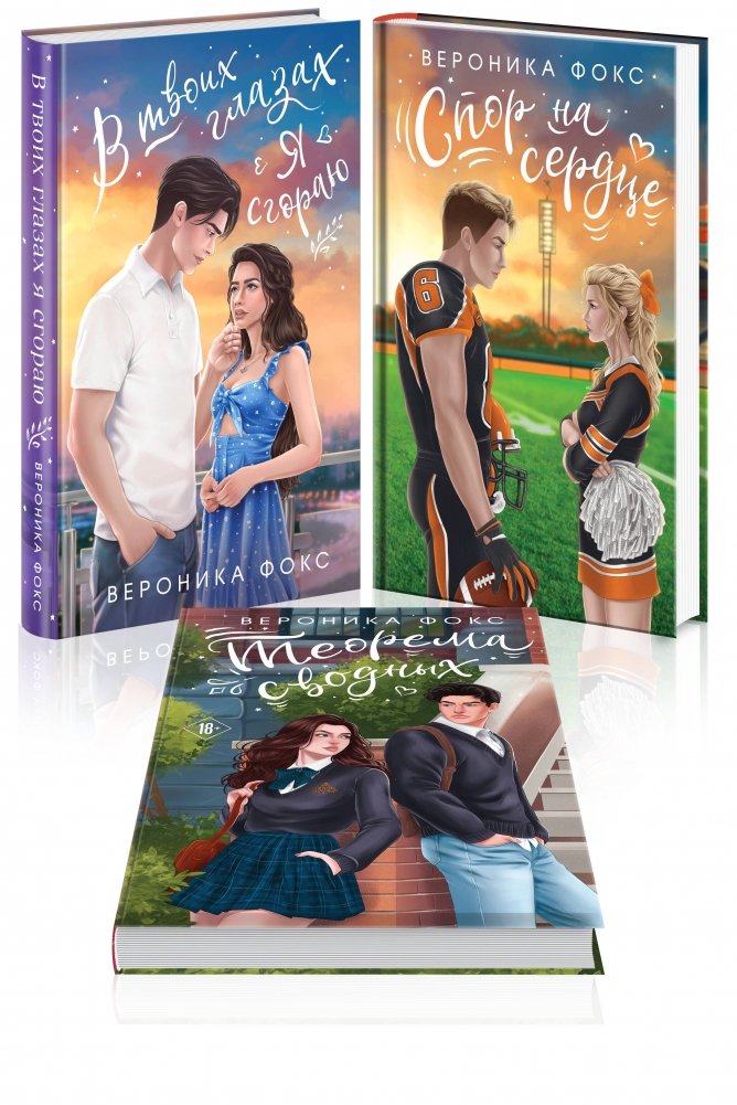 Комплект из 3-х романов Вероники Фокс: "В твоих глазах я сгораю", "Спор на сердце", "Теорема сводных" "В твоих глазах я сгораю": Когда ты безнадежно влюблена в парня своей старшей сестры. Когда судьба сводит вас вместе и толкает в его объятия. Когда оказывается, что ваши чувства взаимны. Когда вам нужно принять себя и довериться друг другу. Когда вы встаете против целого мира, чтобы сберечь свои чувства. Главное, не сгореть в бушующем пламени… "Спор на сердце": Учиться в одном ВУЗе с мажорами - это жёсткий квест для обычной девчонки. А когда самый брутальный и наглый парень в скоростном режиме проходит путь от ненависти до любви к тебе, тут совсем потеряешь голову. Так произошло с Лерой, на свою беду столкнувшейся однажды в институтском коридоре с сыном ректора. Чувства искрят, свидания в запретных местах, танцы на вечеринке... Но что это? Почему интимное фото Леры пересылает друг другу весь институт? Вся любовь - розыгрыш, спор, челлендж? "Теорема сводных": Тео возненавидел Лию, как только ее нога переступила порог его дома. Они сводные, а значит, между ними не может быть ничего общего. Сводный пытается разрушить ее новую жизнь, а она всячески игнорирует любую его выходку. И это чертовски сильно бесит его. Но что, если через ненависть друг к другу им удастся отыскать в своих сердцах настоящую первую любовь?