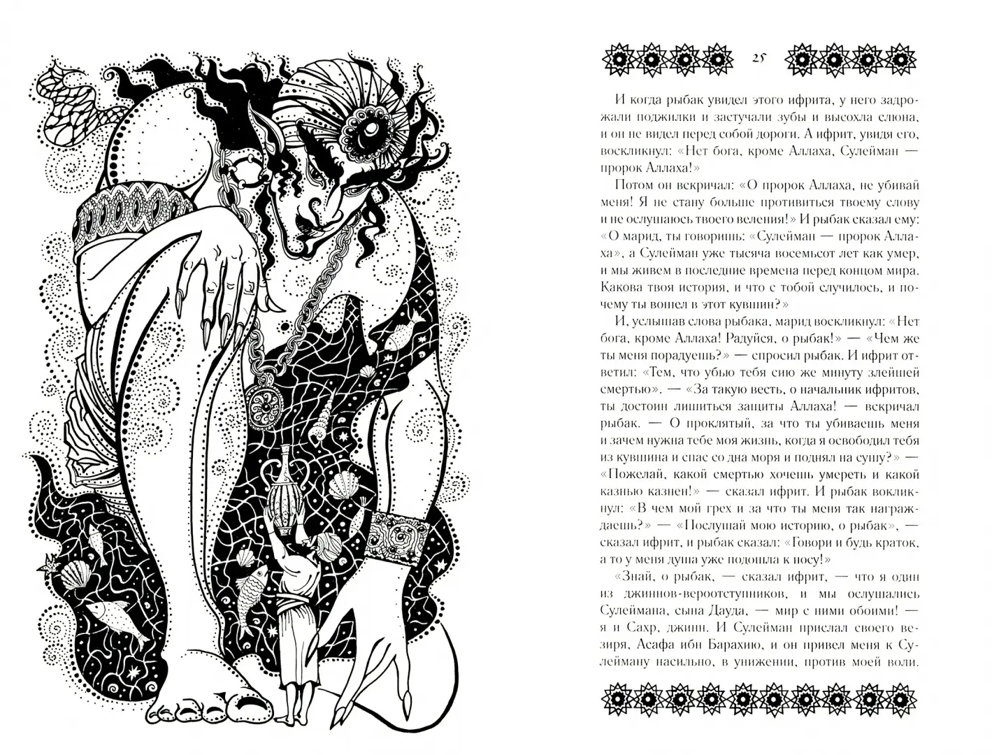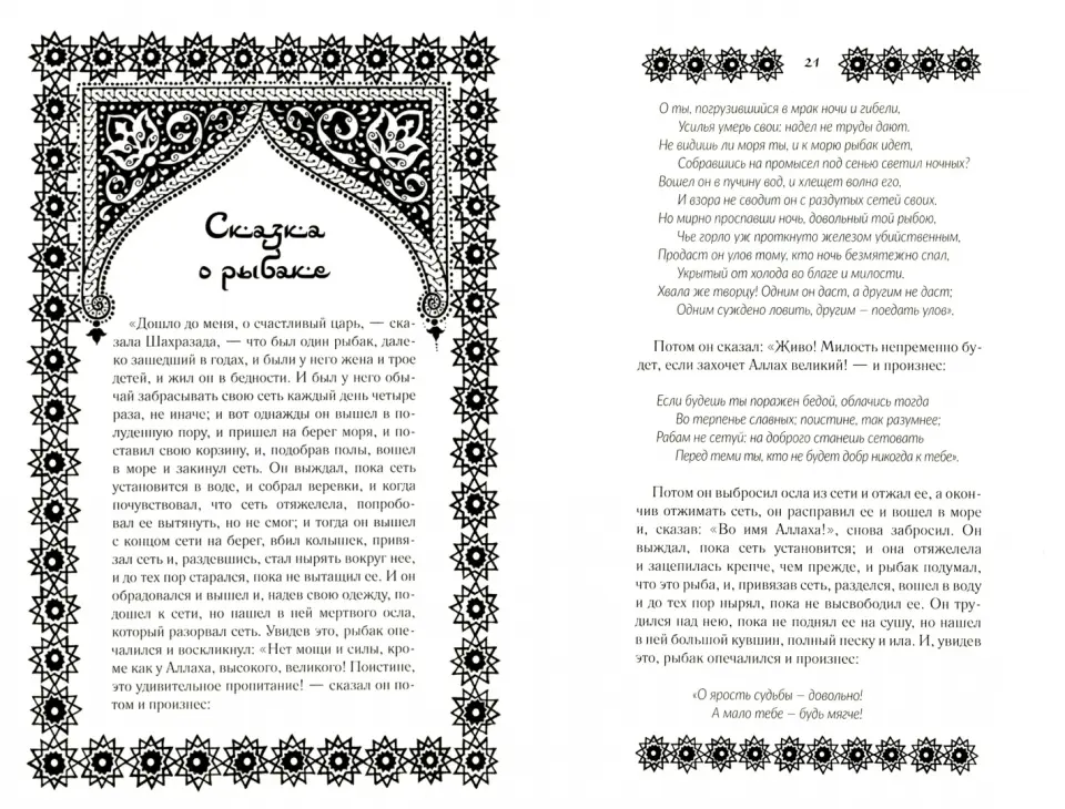 В историях прекрасной Шахразады переплетаются героические и плутовские, мифологические и любовные сюжеты индийского, персидского, арабского народов. Причудливая фантазия, сложные авантюры, яркие описания удивительных стран и городов, а также обольстительные красавицы, богатейшие правители, джинны и колдуны-все это прихотливо переплетается с реалистическим изображением жизни и быта простых людей, ловких и неунывающих.