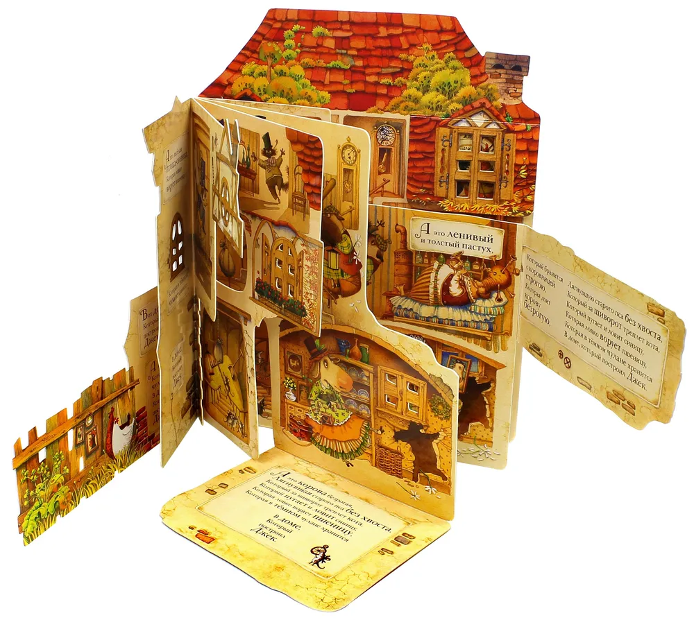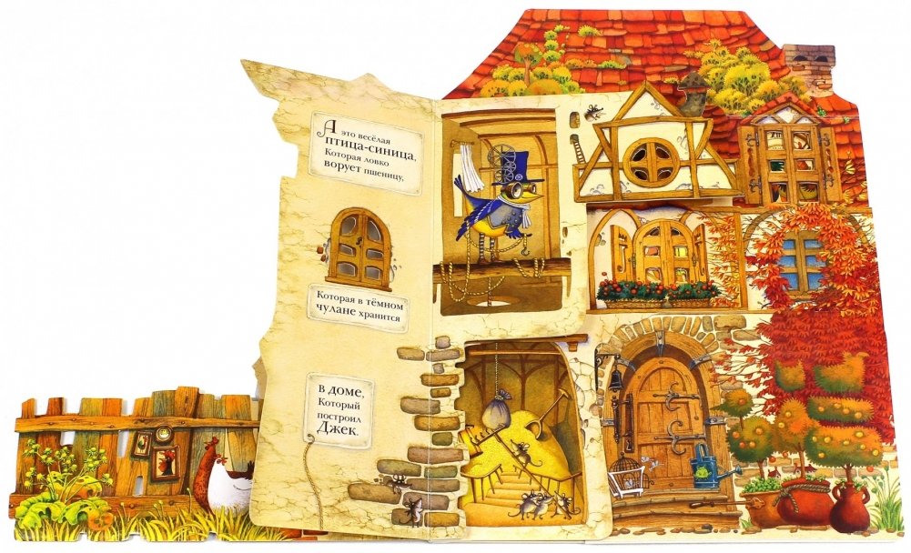 И всё здесь, как в настоящем доме - и резные окошки, и тёмный чулан, в котором пшеница хранится, и чердак, откуда строит козни птица-синица, и лесенки, по которым снуют туда-сюда неугомонные обитатели, и уютная комнатка, где корова безрогая и молочница строгая спасаются от… Впрочем, это секрет. История почти детективная, с ограблениями и преследованиями, безупречно переведённая Самуилом Маршаком и остроумно нарисованная Ольгой Попугаевой и Дмитрием Непомнящим.