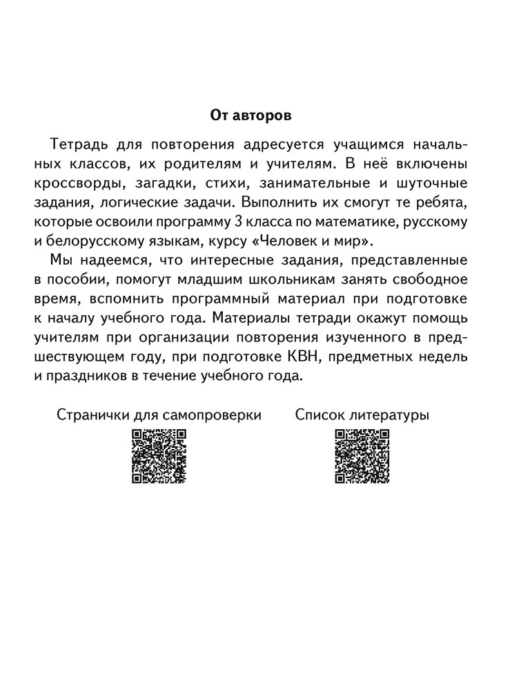 Тетрадь для повторения включает интересные и занимательные задания по предметам «Математика», «Русский язык», «Беларуская мова», «Человек и мир». Предлагаемые материалы помогут школьникам занять свободное время, повторить изученное в предыдущем классе и подготовиться к началу нового учебного года.