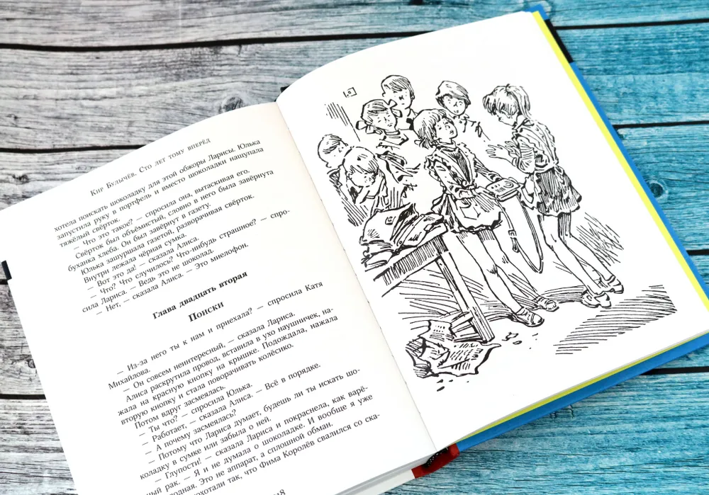 Самая известная книга Кира Булычёва о приключениях Алисы Селезнёвой, знаменитой девочки из будущего! Шестиклассник Коля обнаруживает в квартире соседа настоящую машину времени и попадает в будущее, где учится флипать и выращивать коралловые дома, чуть не улетает на Марс и спасает от космических пиратов удивительный прибор - миелофон. Но теперь пираты охотятся за мальчиком, а миелофон нужно обязательно вернуть девочке Алисе - и всё это уже не в будущем, а в Москве 1970-х.