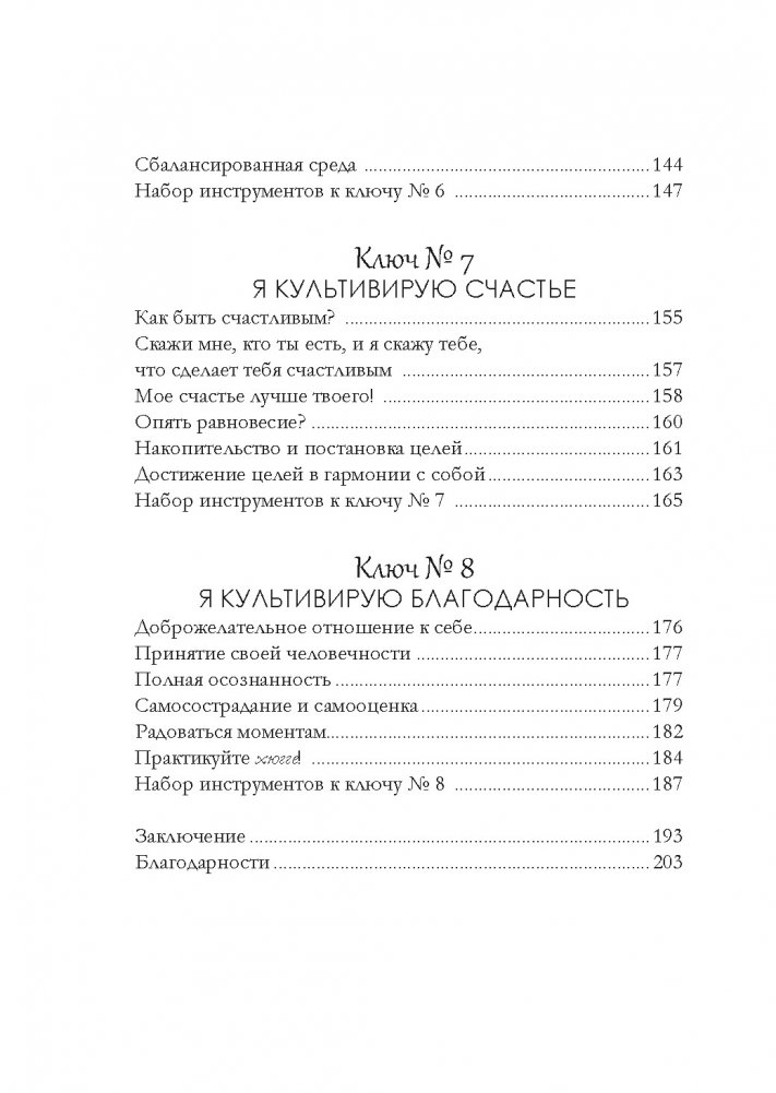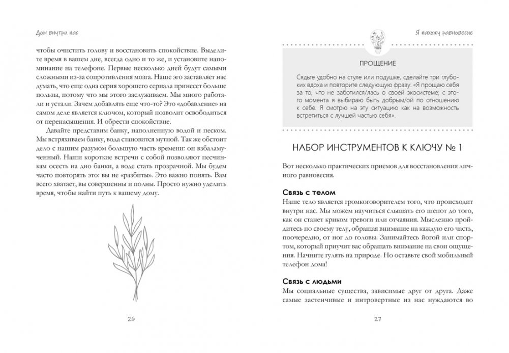 Катя Морен и Максим Морен предлагают остановиться и с помощью их концепции «дома внутри нас» понять, что с нами происходит. Восемь ключей научат: принимать свои особенности, как Доминик принял СДВГ; уделять себе время для восстановления, как Эммануэль, что минимум 24 часа в месяц посвящает исключительно себе; не брать чужую ответственность, как Шанталь, решившая больше не тащить на себе лишний груз.