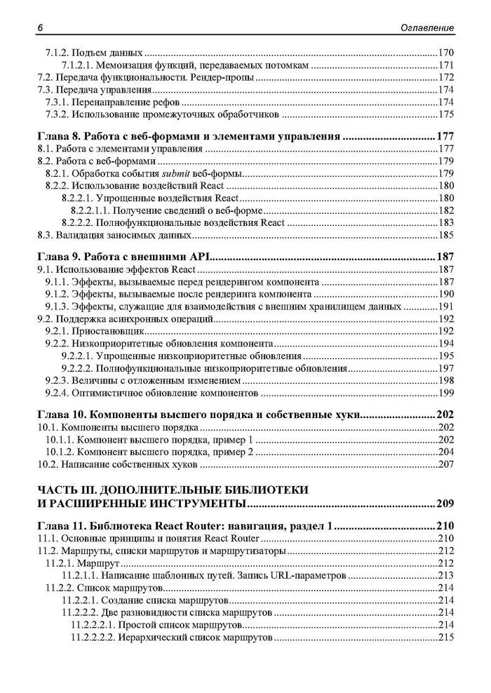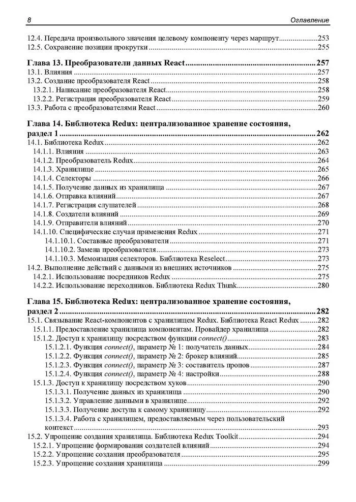 Книга посвящена программированию веб-приложений на языке JavaScript с применением популярного веб-фреймворка React. Дается вводный курс, наглядно, по шагам описывающий разработку несложного веб-приложения — списка запланированных дел. Описываются базовые инструменты: создание и настройка React-проекта, написание компонентов, язык JSX, передача данных между компонентами и создание веб-форм. Рассматриваются полезные дополнительные библиотеки: React Router (навигация), Redux, React Redux и Redux Toolkit (централизованное хранилище данных), Formik (быстрая разработка веб-форм), Yup (валидация), React Reveal (анимационные эффекты) и др. Рассказывается о разделении кода, обработке ошибок, средствах отладки, публикации готового веб-приложения и рендеринге на стороне сервера.