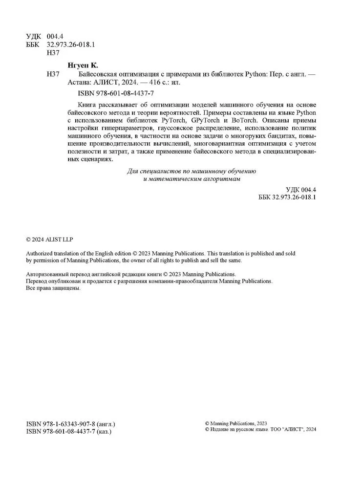 Книга рассказывает об оптимизации моделей машинного обучения на основе байесовского метода и теории вероятностей. Примеры составлены на языке Python с использованием библиотек PyTorch, GPyTorch и BoTorch. Описаны приемы настройки гиперпараметров, гауссовское распределение, использование политик машинного обучения, в частности на основе задачи о многоруких бандитах, повышение производительности вычислений, многовариантная оптимизация с учетом полезности и затрат, а также применение байесовского метода в специализированных сценариях.