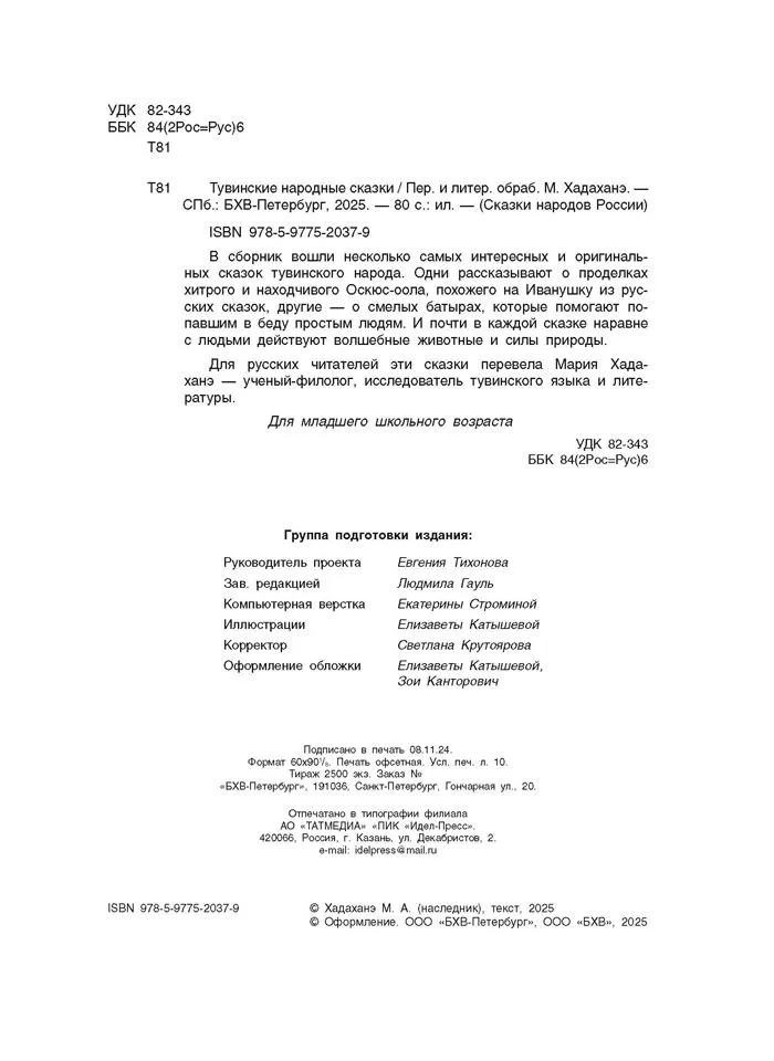 Для русских читателей эти сказки перевела Мария Хадаханэ — ученый-филолог, исследователь тувинского языка и литературы.