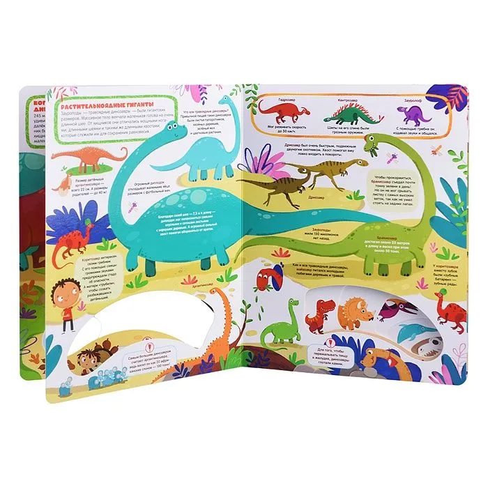 Красочная энциклопедия «Динозавры» от торговой марки Malamalama с оригинальной вырубкой — первый проводник малыша в мир доисторических ящеров. Книга ответит на сотни вопросов маленьких почемучек о динозаврах: какие у них когти, как они дерутся, зачем им шипы, чем они питались, куда пропали динозавры. Специальная крупная выемка для пальчиков поможет ребёнку самостоятельно с лёгкостью перелистывать страницы, будто погружаясь в таинственный портал в историю.