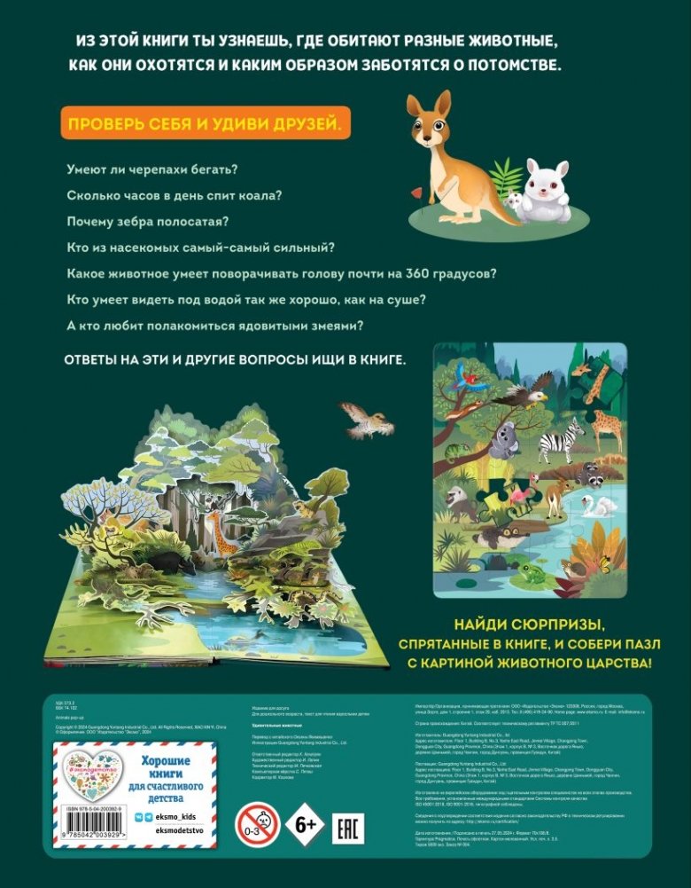 В 3d-книге "Удивительные животные" ты узнаешь, где обитают разные животные, как они охотятся и каким образом заботятся о потомстве. Умеют ли черепахи бегать? А сколько часов в день спит коала? Почему зебра полосатая? Кто из насекомых самый сильный? Ответить на все вопросы тебе помогут познавательные окошки, подвижные элементы у разнообразных животных, а также великолепная панорама джунглей! Скорее открывай все окошки – будет интересно!