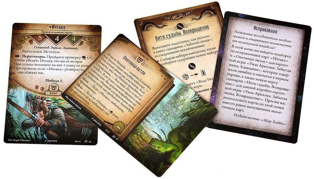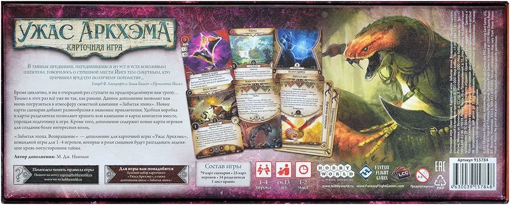 "Забытая эпоха. Возвращение" – дополнение для карточной игры "Ужас Аркхэма", командной игры для 1-4 игроков, которые в роли сыщиков будут разгадывать леденящие кровь потусторонние тайны.