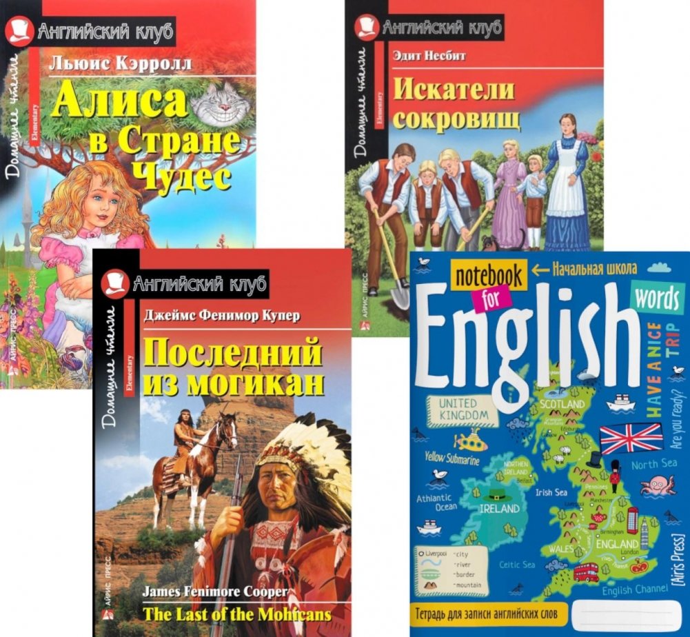 Алиса в Стране Чудес; Искатели сокровищ; Последний из могикан; Тетрадь для записи английских слов: Уровень Elementary
