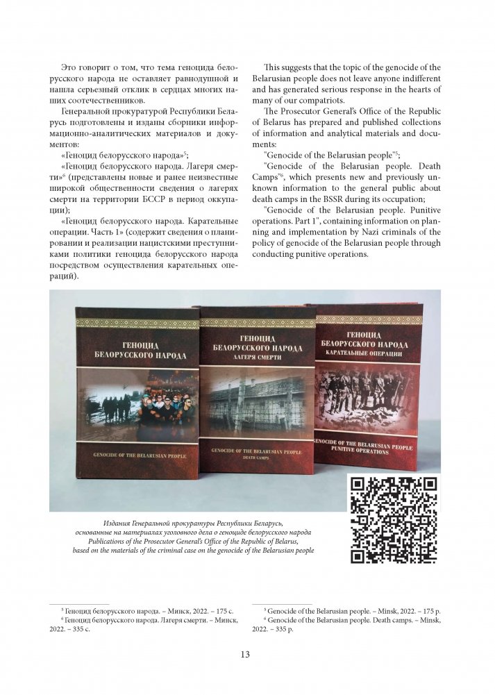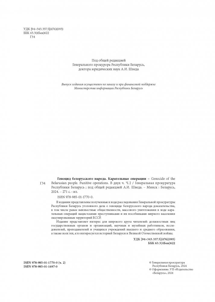 В издании представлены полученные в ходе расследования Генеральной прокуратуры Республики Беларусь уголовного дела о геноциде белорусского народа доказательства, в том числе ранее неизвестные общественности, массового уничтожения в ходе карательных операций нацистскими преступниками и их пособниками мирного населения оккупированных территорий БССР.